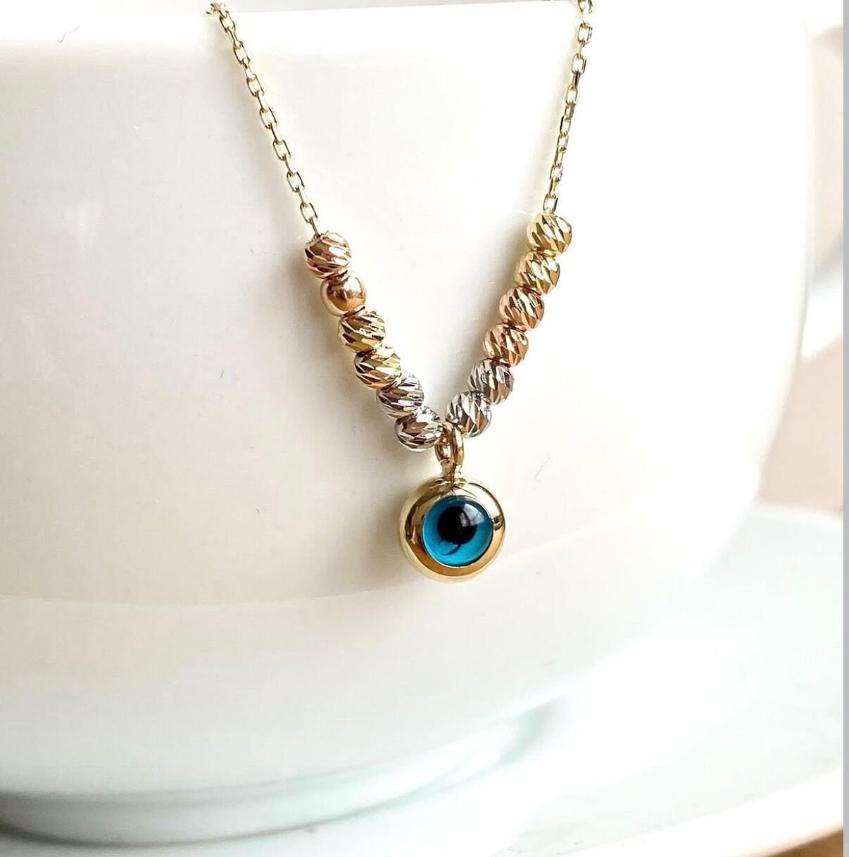Altın kolye modelleri arasında öne çıkan bu tasarım, hem estetik hem de anlamlı yapısıyla günlük kullanım için ideal bir seçenektir. Parlak dorika toplar ve göz boncuk detayı sayesinde ışıltılı ve dikkat çekici bir stil oluşturur.