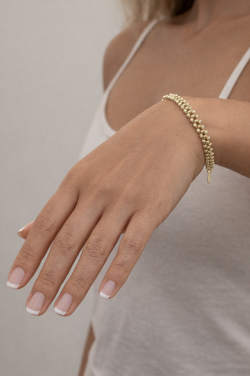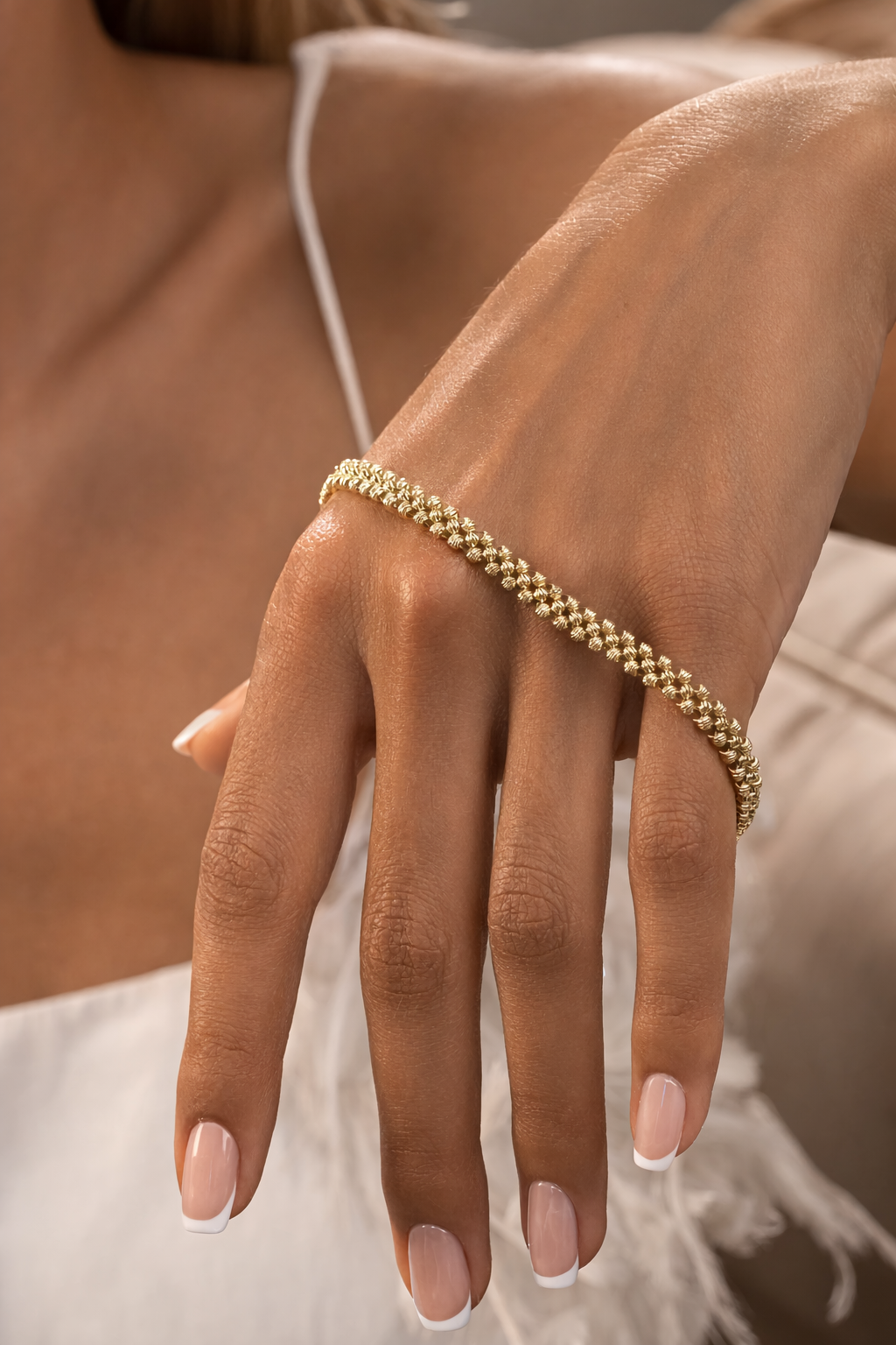 14 Ayar Altın Dorika Bileklik, parlak dorika toplarıyla tasarlanmış zarif ve modern bir bileklik modelidir. Işıltılı yüzeyiyle dikkat çeken 14 Ayar Altın Dorika Bileklik, 14 ayar altın yapısı sayesinde hem estetik hem de dayanıklı bir kullanım sunar. Zarif ve minimal tasarımıyla öne çıkan 14 Ayar Altın Dorika Bileklik, günlük kullanım için ideal bir takı modelidir.